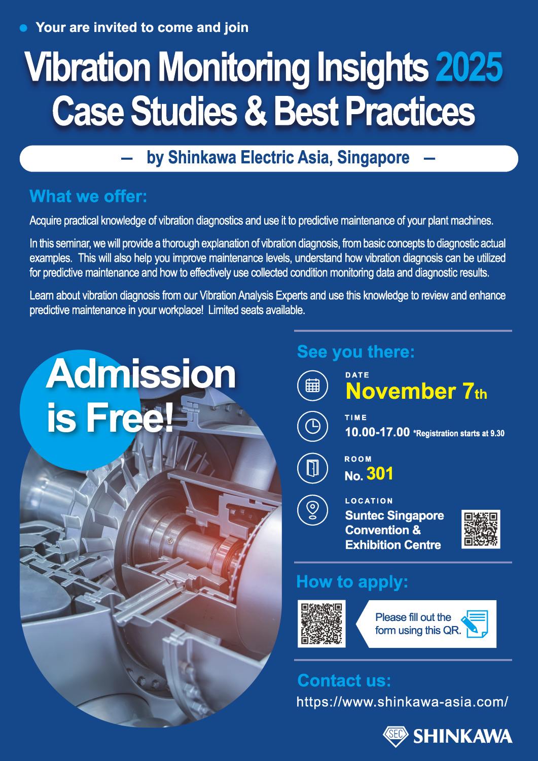 2025/10/21 Exhibition / Seminar Vibration Monitoring Insights 2025-Case studies & Best Practices, in Singapore We will hold a one-day vibration diagnostics seminar on 7 Nov. 2025. We have a few more seats available – please register NOW via QR on the leaflet below. If you inquiry about this page, please contact us below link. Contact Us