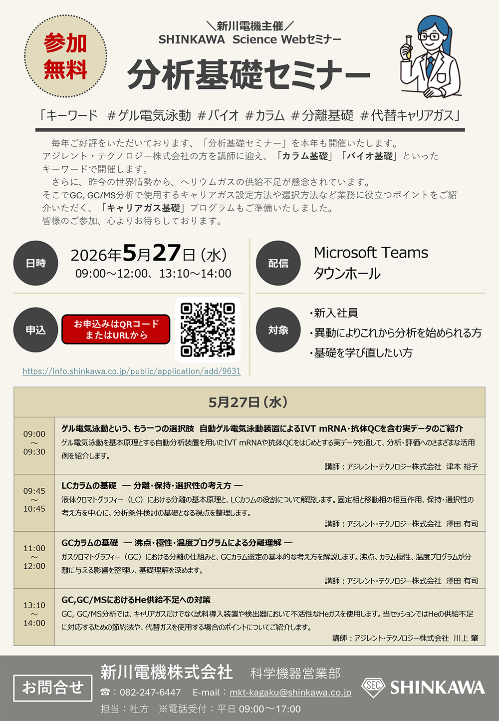 2026/04/20 ニュース/トピックス展示会/セミナー SHINKAWA Science Webセミナー『分析基礎セミナー』開催のお知らせ 毎年好評の分析基礎セミナーを今年も開催! アジレント・テクノロジー株式会社の方を講師に迎え、「カラム基礎」「バイオ基礎」といったキーワードで開催します! 昨今の不安定な世界情勢の影響を受け、ヘリウムガスの供給不足が深刻な課題となっています。 そこで今回は、GCおよびGC/MS分析における「キャリアガス」に焦点を当て、最適な設定方法や代替ガスの選択指針など、実務に直結するノウハウを詳しくご紹介するプログラムを新しくご用意しました。安定した分析業務を維持するための備えとして、ぜひご活用ください。 お申込みはこちら 開催概要 開催日時 2026年5月27日(水) 9:00~14:00【昼休憩:12:00~13:10】 配信 Microsoft Teams タウンホール 主催 新川電機株式会社 参加費用 無料 注意事項 同業他社さまにはご参加をご遠慮頂いております。 申し訳ございませんが、ご理解のほど宜しくお願いいたします。 お申し込みいただいた方全員に全セミナー視聴可能なURLをご案内いたします。 一部セミナーのみのご視聴をご希望の場合は、希望するセミナーの開始時間に合わせて視聴URLへアクセスください。 終了時刻は多少時間が前後する場合がございます。あらかじめご了承ください。 プログラム 時間 タイトル / 内容 9:00~9:30 ゲル電気泳動という、もう一つの選択肢自動ゲル電気泳動装置によるIVT mRNA・抗体QCを含む実データのご紹介 ゲル電気泳動を基本原理とする自動分析装置を用いたIVT mRNAや抗体QCをはじめとする実データを通して、分析・評価へのさまざまな活用例を紹介します。 講師 : アジレント・テクノロジー株式会社 津本 裕子 様 9:45~10:45 LCカラムの基礎 ― 分離・保持・選択性の考え方 ― 液体クロマトグラフィー(LC)における分離の基本原理と、LCカラムの役割について解説します。固定相と移動相の相互作用、保持・選択性の考え方を中心に、分析条件検討の基礎となる視点を整理します。 講師 : アジレント・テクノロジー株式会社 澤田 有司 様 11:00~12:00 GCカラムの基礎 ― 沸点・極性・温度プログラムによる分離理解 ― ガスクロマトグラフィー(GC)における分離の仕組みと、GCカラム選定の基本的な考え方を解説します。沸点、カラム極性、温度プログラムが分離に与える影響を整理し、基礎理解を深めます。 講師 : アジレント・テクノロジー株式会社 澤田 有司 様 13:10~14:00 GC,GC/MSにおけるHe供給不足への対策 GC, GC/MS分析では、キャリアガスだけでなく試料導入装置や検出器において不活性なHeガスを使用します。当セッションではHeの供給不足に対応するための節約法や、代替ガスを使用する場合のポイントについてご紹介します。 講師 : アジレント・テクノロジー株式会社 川上 肇 様 お申込みはこちら 画像をクリックするとPDFをご覧いただけます。 お申込みはこちら この記事に関するお問い合わせはこちら 問い合わせする