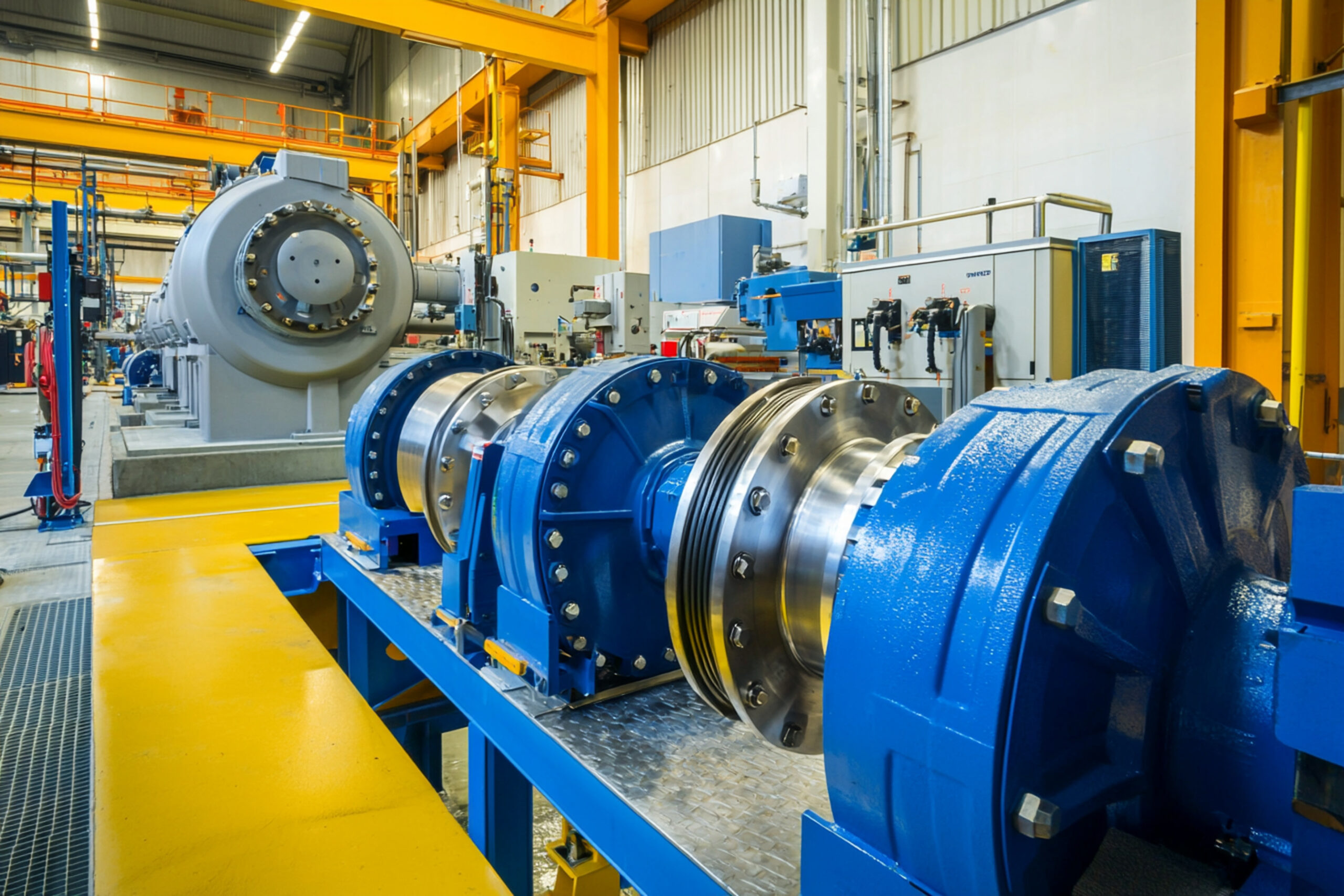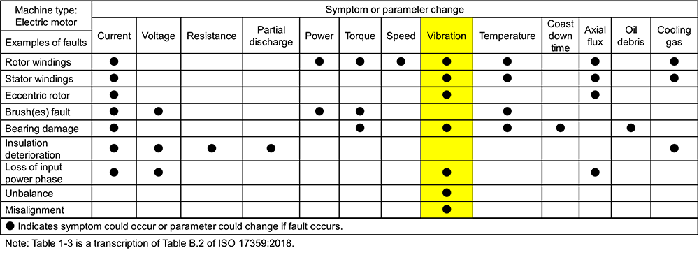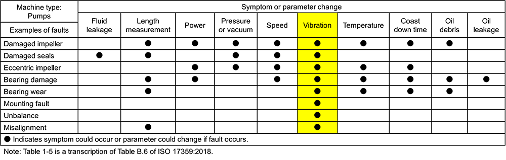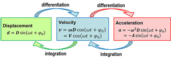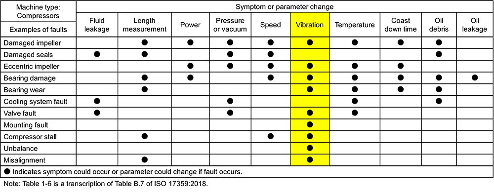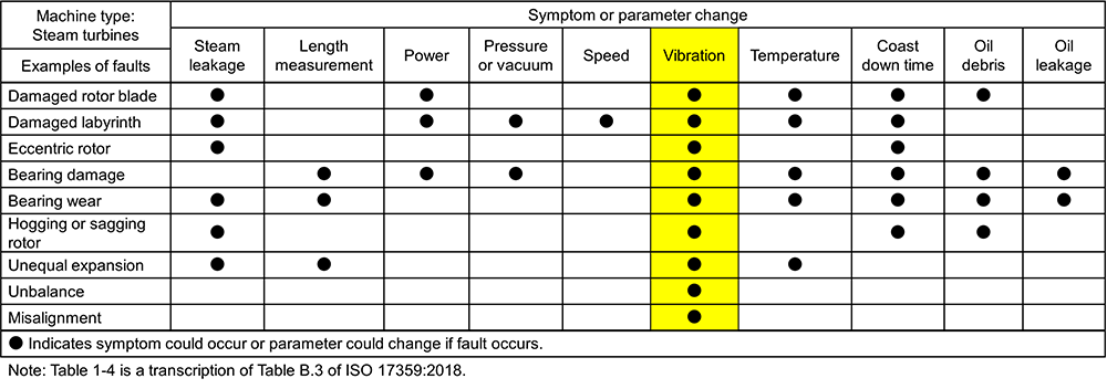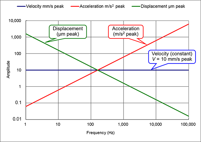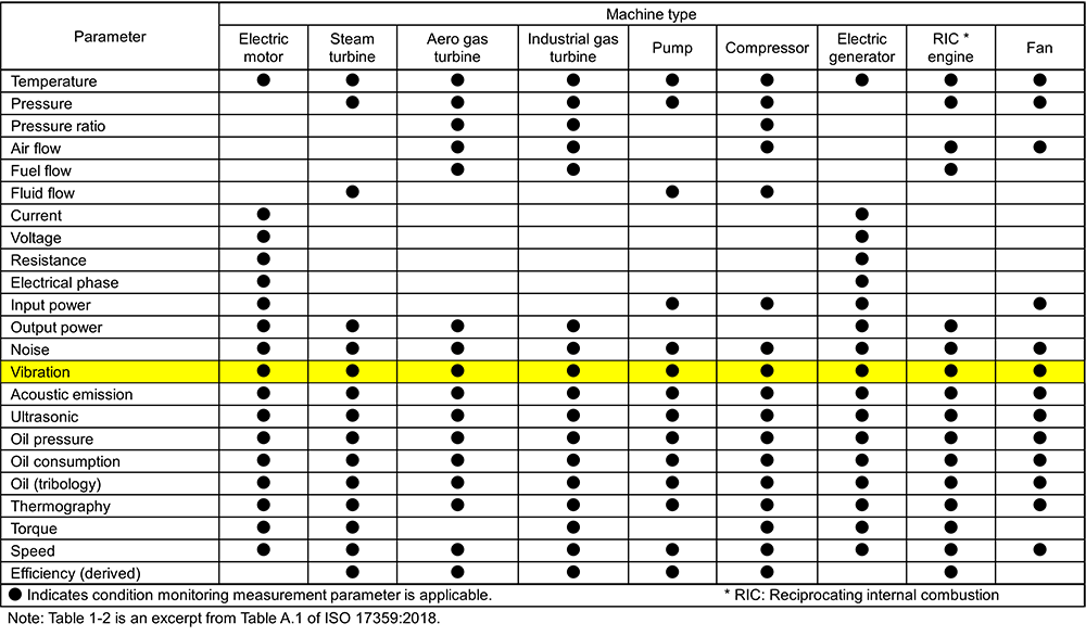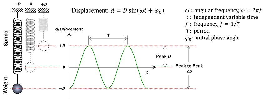 お役立ち情報 技術情報 2026/01/29 technical column TC-01 - Condition Monitoring Based on Vibration of Rotating Machinery Introduction There are various condition monitoring parameters such as temperature, pressure, flow rate, torque, etc. to monitor machine condition. This column discusses condition monitoring and diagnosis by vibration, which is effective in detecting and diagnosing many abnormalities and damage phenomena in machine condition monitoring and can be widely applied to various types of machines. The most fundamental approach to condition monitoring of rotating machinery involves measuring vibration in the rotating shaft and/or bearings. This involves constantly or periodically monitoring the vibration amplitude values and/or tracking trends in vibration amplitude. However, given the wealth of information contained within the vibrations generated by rotating machinery, it is possible to detect and diagnose abnormal factors through time-domain and frequency-domain analysis of the original vibration waveforms, in addition to monitoring vibration amplitude values. From the perspective of measurement and monitoring, rotating machinery can be broadly classified into two categories: large high-speed rotating machinery supported by journal bearings and general-purpose rotating machinery supported by rolling element bearings. In this column, we will explain the basics of vibration and its importance in condition monitoring parameters. In the next and subsequent columns, we will provide an overview of condition monitoring systems for large high-speed rotating machinery and general-purpose rotating machinery. 1. What is vibration ? When considering the concept of vibration, one might envision objects oscillating or exhibiting a rattling or shakiness upon contact. However, from an engineering perspective, let us explore the definition of vibration in the context of machine condition monitoring and diagnostics. To do so, we will refer to the ISO 2041 standard (1), which provides the terminology utilized in mechanical vibration and condition monitoring. ISO 2041 defines “vibration” as “mechanical oscillations about an equilibrium point”, and further defines “oscillation” as “variation, usually with time, of the magnitude of a quantity with respect to a specified reference when the magnitude is alternately greater and smaller than the specified reference”. Accordingly, the “mechanical vibration” under discussion can be defined as “a variation, usually with time, of the magnitude of a quantity of motion or position of a mechanical system with respect to a specified reference when the magnitude is alternately greater and smaller than the specified reference”. For example, if the rotor of a rotating machine swings as it rotates, and from a certain direction it appears to move closer and further away repeatedly, this is called “shaft vibration”. Furthermore, if the shaft vibration is transmitted to the casing via the bearings, and the position of a certain part of the casing repeatedly fluctuates over time, this is called “casing vibration”, and both of these can be referred to as “machine vibration”. So, what is the repetition speed of “the magnitude is alternately greater and smaller than the specified reference” in mechanical vibration, in other words, the vibration frequency (number of repetitions per second: Hz)? In the field of machine condition monitoring and diagnosis, the measurement target typically ranges from a few Hz to 10 kHz. In reality, vibration phenomena can exhibit complex behavior, which can be considered a synthesis of “simple harmonic vibration” at multiple frequencies. Therefore, it is essential to understand “simple harmonic vibration” as a fundamental concept. According to ISO 2041, “simple harmonic vibration (sinusoidal vibration)” is defined as “periodic vibration where the values of the vibration parameters can be described as sinusoidal functions of the independent time variable”. In this definition, the single harmonic vibration can be expressed by equation (1). \begin{equation} y=y_{0}\sin \left( \omega t+\varphi _{0}\right) \tag{$1$} \end{equation} Where \begin{alignat}{2} & y & \; & \text{is the simple harmonic vibration;} \\ & y_{0} & \; & \text{is the amplitude;} \\ & ω & \; & \text{is the angular frequency;} \\ & t & \; & \text{is the independent variable time;} \\ & \varphi _{0} & \; & \text{is the initial phase angle of the vibration.} \\ \end{alignat} When the vibration frequency is \(f\), the angular frequency ω is as in equation (2). \begin{equation} \omega =2\pi f \tag{$2$} \end{equation} Figure 1-1 shows a simple system consisting only of an ideal spring and a weight with no damping as an example of single harmonic vibration. At first, the weight is pulled downward by a displacement \(D\) from the equilibrium point (the zero position), i.e., to the minus \(D\) position. When the weight is released from this position, it repeatedly moves up and down between plus \(D\) and minus \(D\) with the equilibrium point at its center, and the time variation of this motion shows a sinusoidal waveform as shown in the figure. This motion shows a single harmonic vibration, where \(f\) is the oscillation frequency and \(T\) is the period. If we denote the amplitude of the vibration displacement as \(D\) and the displacement of the simple harmonic vibration as \(d\), we can replace \(y\) in equation (1) by d and \(y_{0}\) by \(D\) to express the equation as in equation (3). \begin{equation} d=D sin( ωt+\varphi_{0} )=D sin( 2πft+\varphi_{0}) \tag{$3$} \end{equation} As shown in Figure 1-1, the amplitude \(D\) is the peak value of the vibration displacement. When measuring the displacement of mechanical vibration, it is common to express it in terms of the peak-to-peak value of \(2D\), which is the difference between the positive peak value and the negative peak value. Figure 1-1: Time waveform of sim