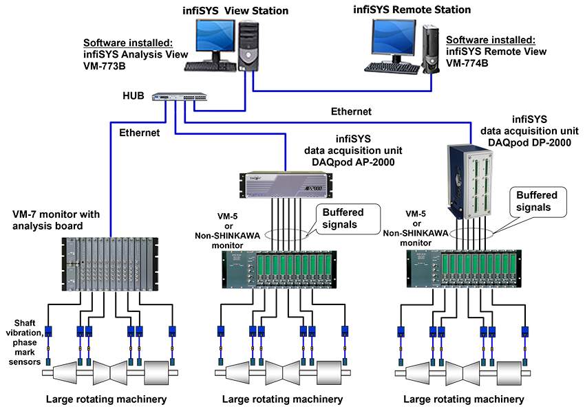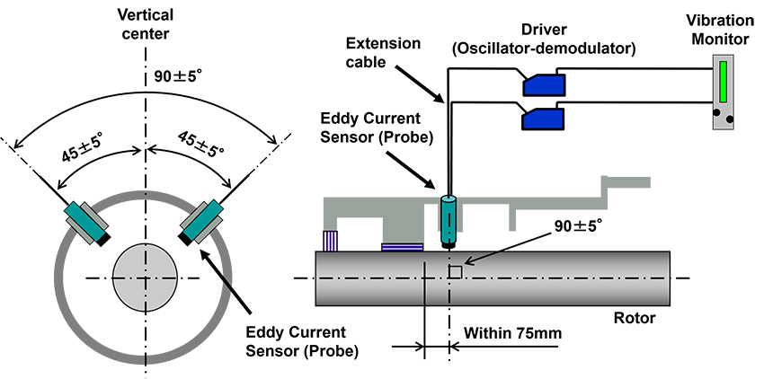 お役立ち情報 技術情報 2026/03/02 technical column TC-02 - Condition Monitoring System for Large Rotating Machinery (Part 1) Large rotating machines such as steam turbines, gas turbines, and centrifugal compressors are used as critical equipment in various plants. These machines are equipped with vibration sensors and condition monitoring equipment, also known as “monitors” or “monitor systems”, to monitor their condition during operation and to protect the machines when abnormal vibrations occur. In addition, a permanent or temporary vibration analysis system is used to investigate the cause of abnormalities. This column provides an overview of systems applied to condition monitoring, vibration analysis, and diagnosis of rotating machinery. 1. Outline of Condition Monitoring System for Large Rotating Machinery Non-contact displacement transducers (proximity transducers) are typically installed on large rotating machines to detect variations in dynamic displacement due to shaft vibration, which is the swing of the rotating shaft itself, and the transducer’s output signals (waveform signals) are converted into vibration amplitude by the vibration monitors. If the vibration amplitude exceeds the alarm threshold, the alarm relay is activated. The monitor is equipped with two types of alarm relay: one for Alarm (Alert) and another for Shutdown (Danger). Up to here, the scope is the displacement transducers and monitors shown in the lower part of Figure 2-1. Furthermore, the vibration analysis and diagnostic system can be constructed by taking the buffered outputs of the vibration monitors into the external analysis data acquisition units or by using the vibration monitors with built-in analysis boards. The buffer output is an unaltered analog replica of the transducer input signal that outputs from the rear terminal block and front BNC connector of the monitor. It is designed to prevent a short circuit of this output to monitor system ground from affecting the operation of the system. In some existing plants, the permanent vibration analysis and diagnosis system is not installed, but only the transducers and the vibration monitors are installed. In such cases, the portable vibration analysis system is employed to collect transient data during machine startup and shutdown, and to perform analysis and diagnosis of abnormal vibrations. Figure 2-1: Example of Machine Condition Monitoring System for Large Rotating Machines2. Condition Monitoring of Large Rotating Machinery and API Standards Shaft vibration measurement is an essential item of condition monitoring and vibration diagnosis for large rotating machines supported by journal bearings, such as steam turbines and centrifugal compressors. In such applications, non-contact displacement sensors (proximity sensors) are employed to detect and measure the behavior of the rotating shaft, as previously described. Non-contact displacement sensors include optical and capacitance sensors. However, these cannot be used in environments where machine oil splashes. Eddy current type displacement sensors, which are unaffected by such environments, are used instead. Figure 2-2 shows examples of the eddy current type displacement transducers. Displacement transducers for shaft vibration measurements generally use the eddy current type sensors that comply with API standard 670 (1). These sensors are mounted to the bearing using mounting brackets or to the machine casing using sleeves. This allows for the measurement of relative vibration between the shaft and bearing or casing. The sensor setting gap is typically 1.2 mm or so. Figure 2-2: Eddy Current Type Displacement Transducer (FK series) The API 670 is an American Petroleum Institute standard that provides detailed requirements for monitoring and protection equipment for critical rotating machinery in petroleum refining and petrochemical plants. The most recent version of this standard is currently the 5th edition, published in November 2014. As indicated by the title of Table 2-1, this standard was originally intended for non-contact shaft radial vibration and shaft axial position monitoring systems. Since the 2nd edition, casing vibration and bearing temperatures have also been included. The 4th edition incorporated overspeed detection and reciprocating compressor piston rod drop monitoring as critical machine protection parameters, prompting a title change to “Machinery Protection Systems.” Table 2-1: Changes in the title of API Standard 670 Edition Title Publication 1st Non-contacting Vibration and Axial Position Monitoring System 1976/06 2nd Vibration, Axial-Position, and Bearing-Temperature Monitoring Systems 1986/06 3rd 1993/11 4th Machinery Protection Systems 2000/12 5th 2014/11 6th Under development as of 2025/03/31 API 670 specifies detailed requirements for shaft vibration and axial position monitoring systems, which are critical monitoring parameters for large rotating machinery. This standard is widely applied for oil-related plants around the world. Additionally, sensors and monitors that are compliant with API 670 are utilized as turbine supervisory instruments (TSI) for power generation turbines in power plants. 3. Sensors for Vibration Measurements When measuring the vibration of rotating machinery, the measurement parameters are vibration displacement, velocity and acceleration, and one of these parameters is applied depending on the application, machine type, and the measuring point. For high speed rotating machines operating above the first critical speed and classified as flexible rotors supported by journal bearings, it is important to understand the dynamic behavior of the rotating shaft, both for the usual condition monitoring and for vibration analysis, therefore, as mentioned in the previous chapter, eddy current non-contact displacement sensors are commonly used to measure shaft vibration in displacement. Since eddy current displacement transducers respon